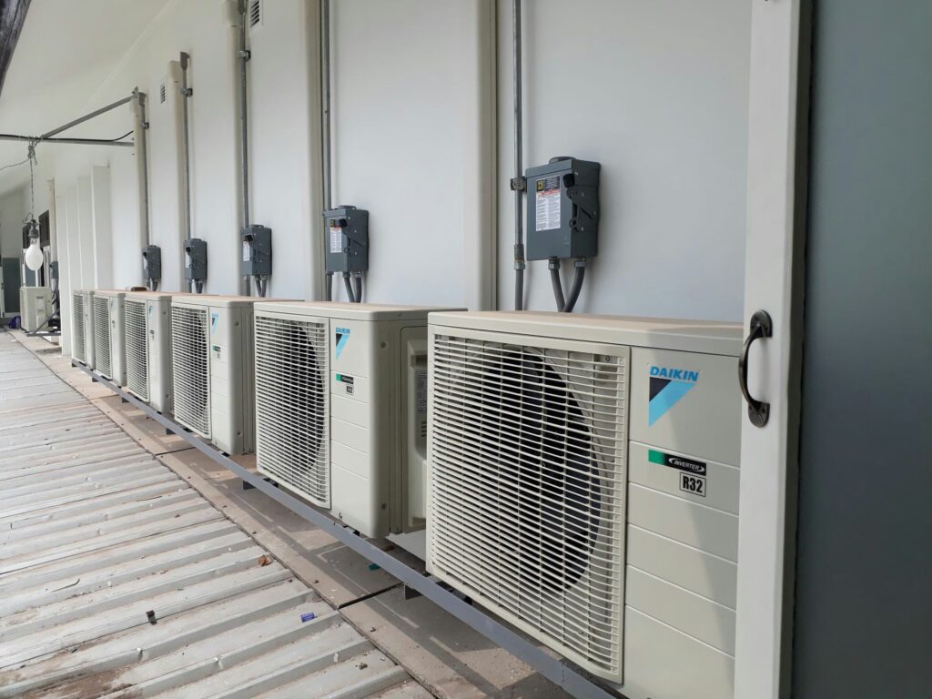 - ระบบ VRF (Variable Refrigerant Flow) ระบบ VRF เหมาะสำหรับอาคารที่มีหลายพื้นที่และต้องการควบคุมอุณหภูมิในแต่ละพื้นที่ได้อย่างแม่นยำ เช่น โรงแรม อาคารสำนักงานขนาดใหญ่ หรืออาคารพาณิชย์ที่มีหลายส่วน โดยช่วยประหยัดพลังงานและเพิ่มความสะดวกสบายให้กับผู้ใช้งานในแต่ละพื้นที่